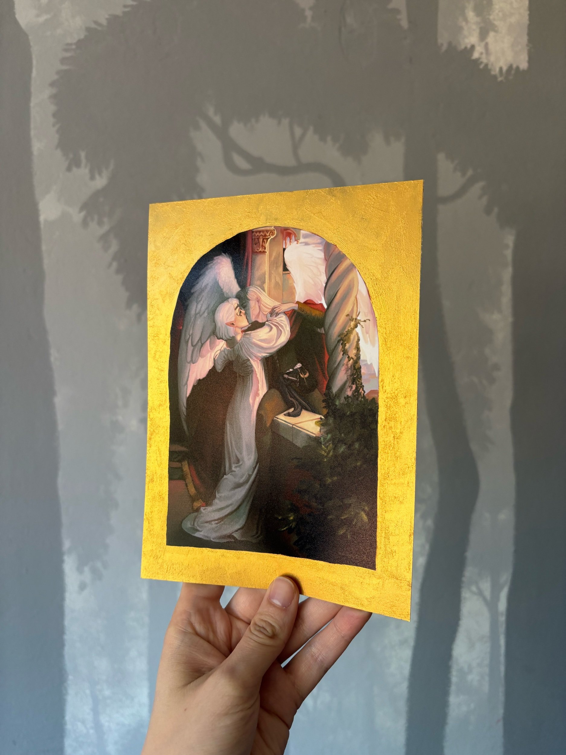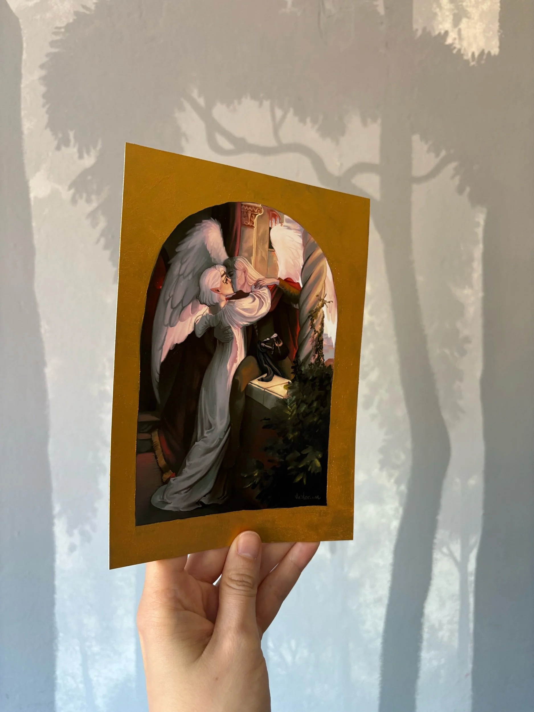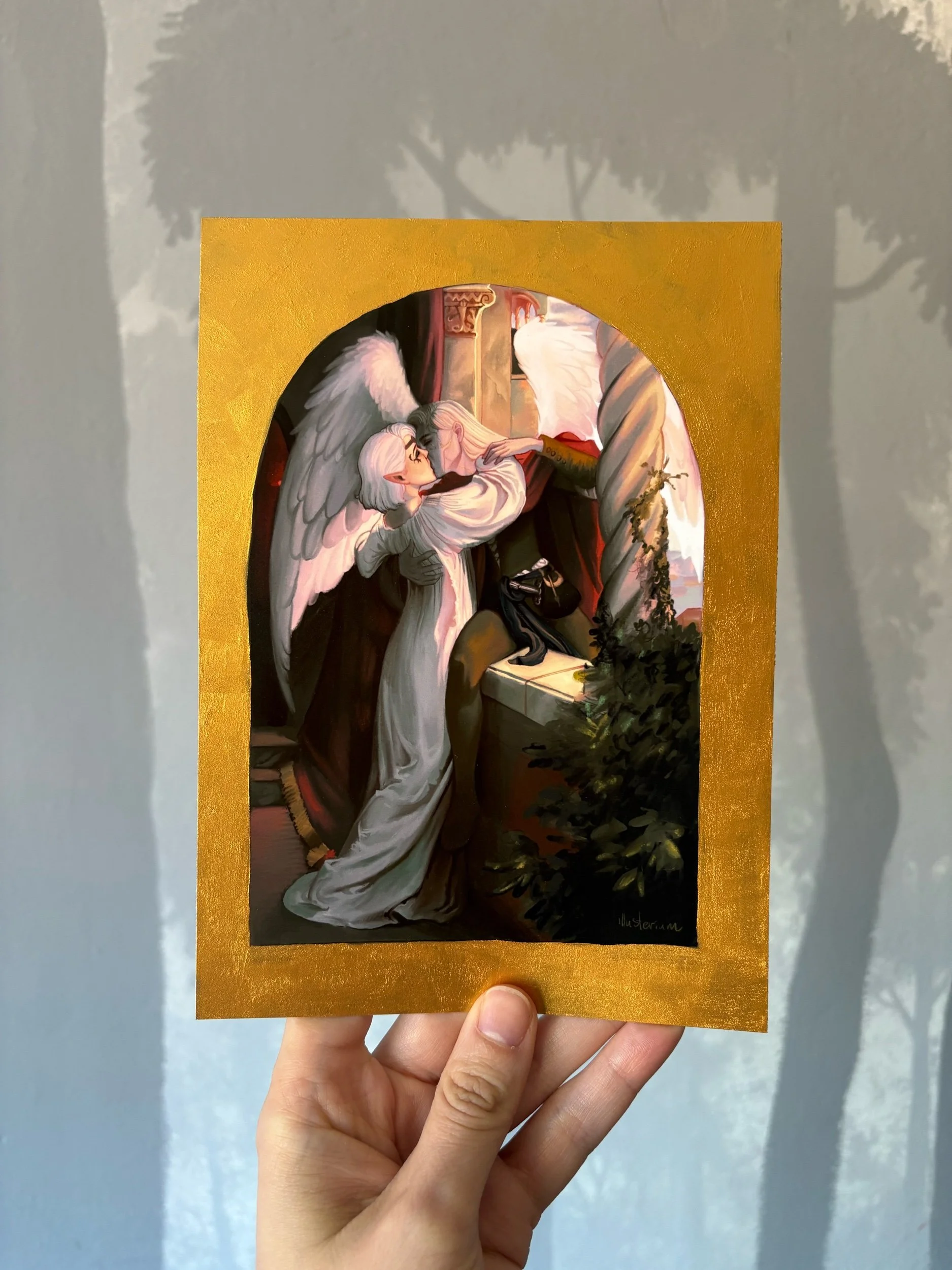 A study of the Romeo and Juliet painting by Sir Francis Dicksee, but with Isobel and Dame Aylin from Baldur’s Gate 3. Painted digitally, the prints have a hand painted border of gold paint, which gives it its classical icon feel.